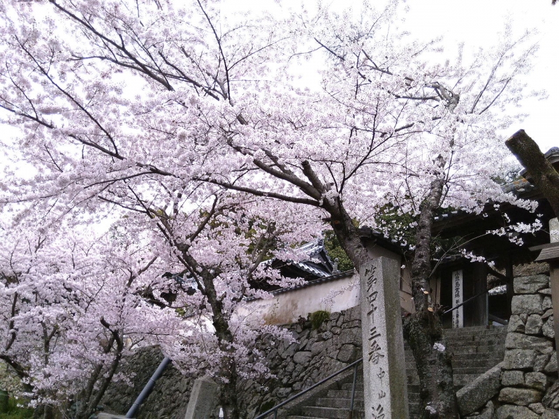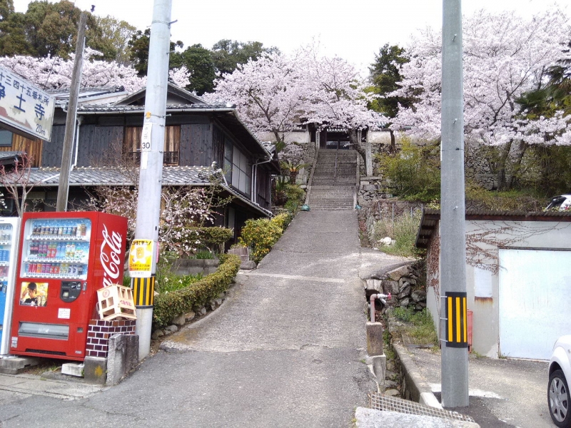 愉快な遍路旅 中山・蛙子池の桜~第43番浄土寺 2017/04/09 ここも隠れ桜の名所、池の周りに桜の木が植えてあります、今日は少し早かった、残念・・一斉に咲くと圧巻でしょう!!!池の下に小豆島一おいしいお米の棚田があります、きれいに田植えの準備ができていました。 中山農村歌舞伎の春日神社まで下り散策、隣に”こまめ”食堂があります、トタン張りのディープな建物、中は客でいっぱいでした。 近くに43番札所浄土寺があります、本尊は阿弥陀如来、こちらの桜は満開、一打合掌・・・気分よし!!